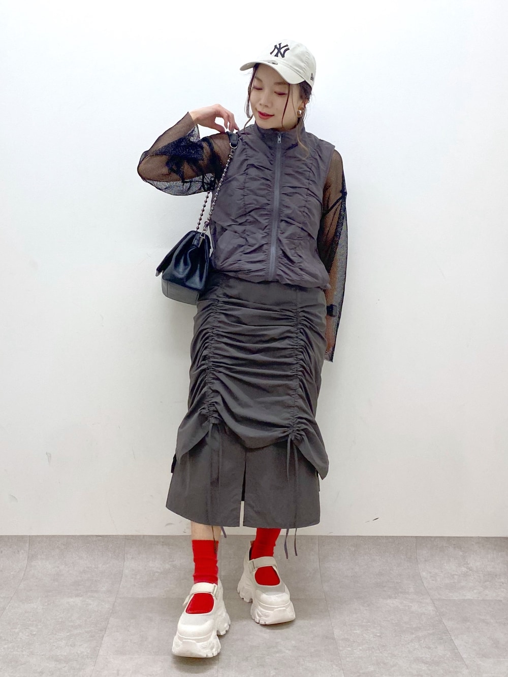 夏まで着回しセットアップ  ̄ ̄ ̄ ̄ ̄ ̄ ̄ ̄ ̄ ̄ ̄ ̄ ̄ 【トップス】 ギャザーのデザインとハイネックでモードに決まります Tシャツ合わせももちろんですがメッシュトップスで初夏スタイルに 【ボトムス】 ベストと同じナイロン素材のスカートはドロストを絞っても丈が短くなり過ぎないので、私でも安心して履けました STAFF BOARD▶︎Chisa *アラフォー低身長なりの大人カジュアルスタイルを楽しんで毎日更新しています!ぜひフォローお願いします◡̈*