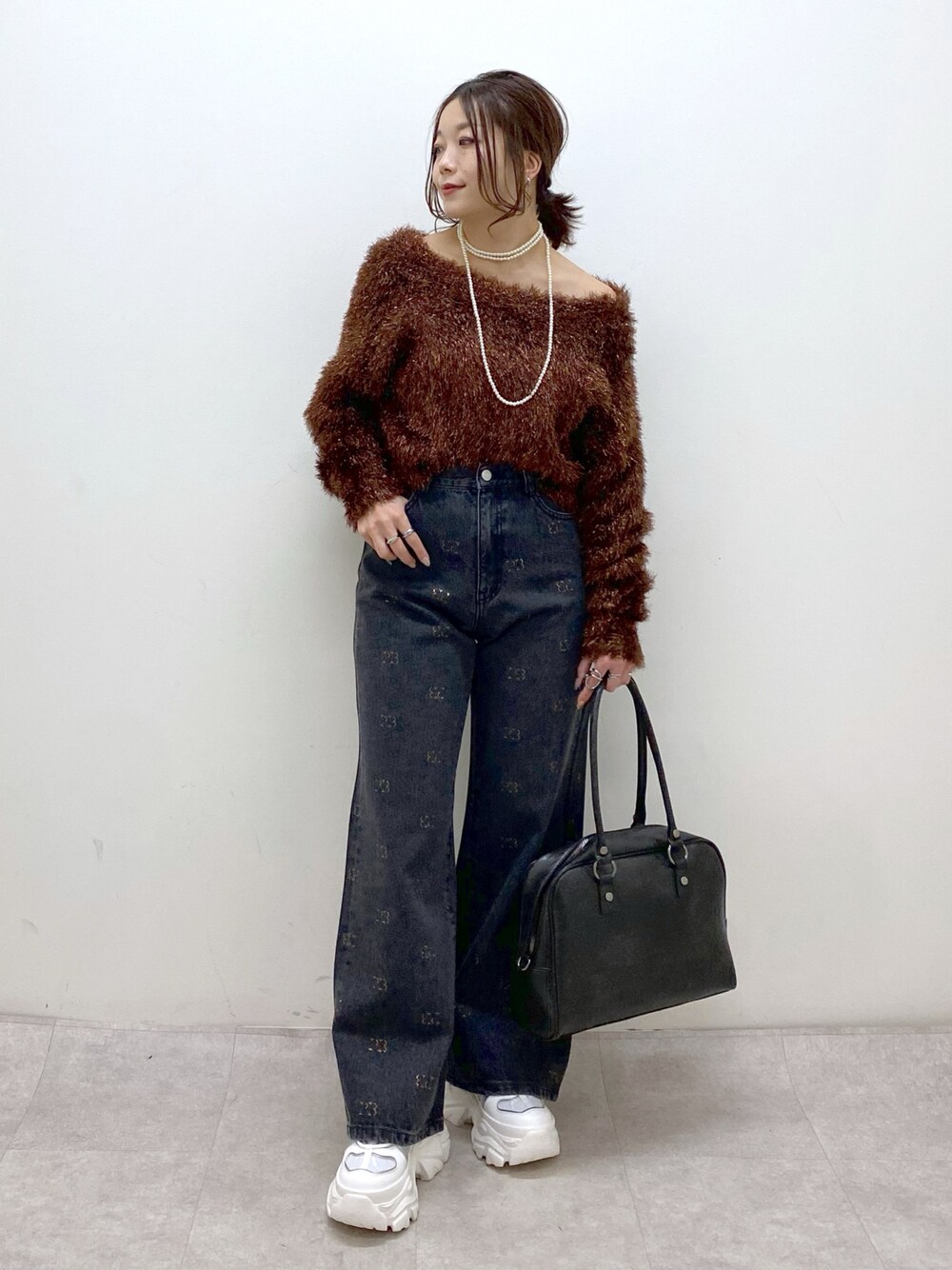 【トップス】 キラキラした糸のシャギーニットは、ふわふわな着心地です オフショルでも着られますがそのまま肩を出さずに着ても、デコルテラインがすっきり見えます 【ボトムス】 ブラックはブロンズのラインストーンでさりげなくキラキラするので、ラメトップス合わせも◎ 遊び感あるモノグラム柄に、ワイド過ぎないテーパードパンツシルエットなので大人っぽくスタイリングを楽しめます STAFF BOARD▶︎Chisa *アラフォー低身長なりの大人カジュアルスタイルを楽しんで毎日更新しています!ぜひフォローお願いします◡̈*