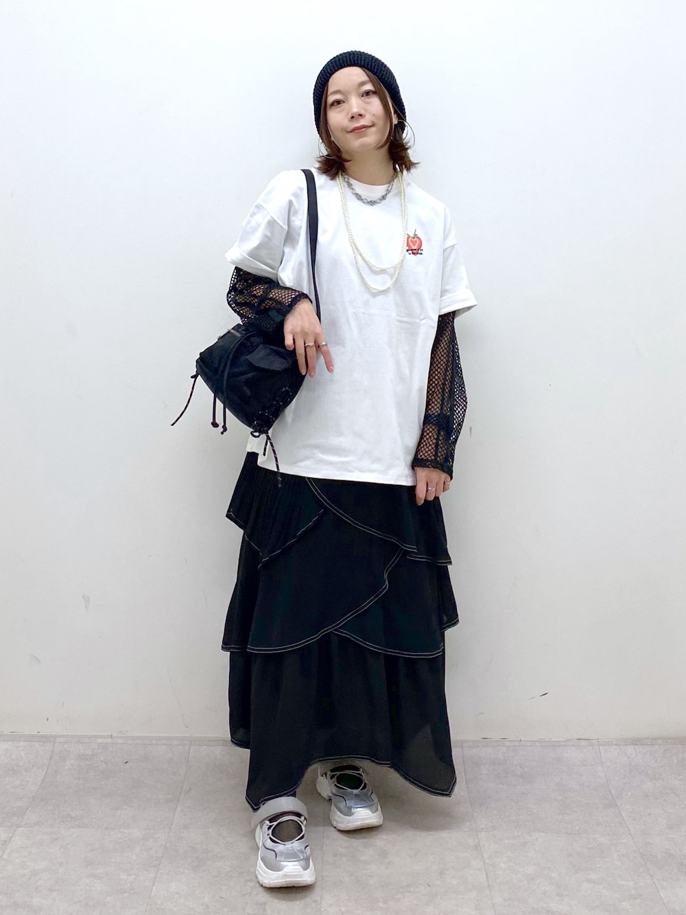 【トップス】 既に大人気なたくさんのいちごを散りばめたプリントTシャツ🍓🍓🍓 PBLIM定番のサイズ感で、Mサイズでもレイヤードしやすいゆったりシルエット しっかりした綿素材で洗ってもくたりにくく、白でも透け感が気になりません 中に合わせたのは今から夏まで着回しできるラインの入ったメッシュトップス Tシャツの中にも外にも着回せます 【ボトムス】 PAGEBOYといえば!のステッチティアードスカート♡ ウエスト周りはすっきり ヒップ周りはフリルでカバーしてくれる細見えシルエット ランダムなフリルとステッチのデザインなので、甘さ控えめに合わせられます STAFF BOARD▶︎Chisa *アラフォー低身長なりの大人カジュアルスタイルを楽しんで毎日更新しています!ぜひフォローお願いします◡̈*