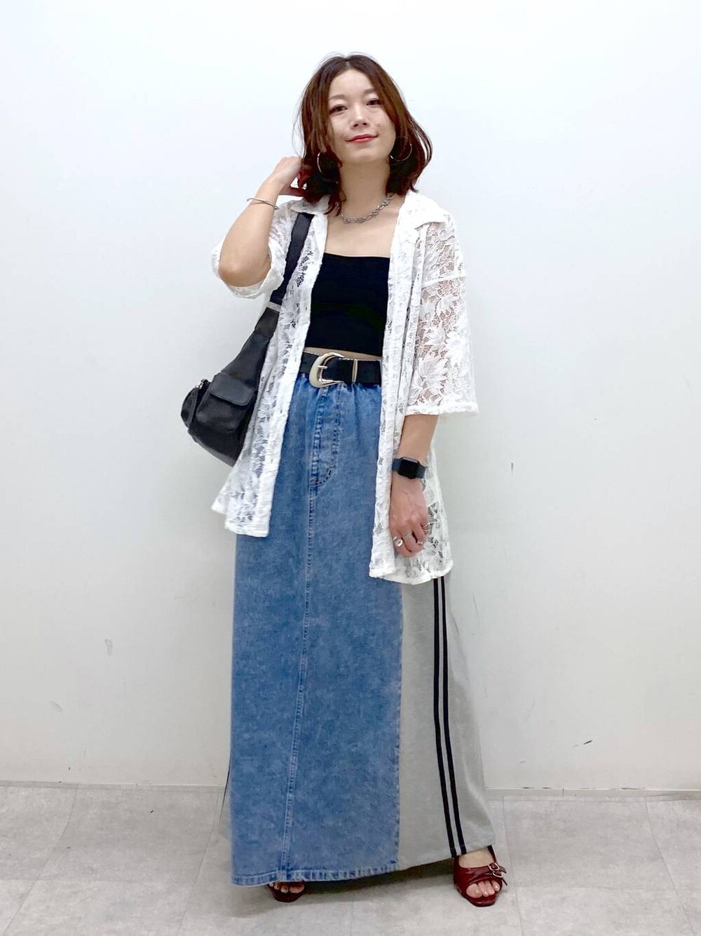 サラッと過ごせる甘め×カジュアルスタイル  ̄ ̄ ̄ ̄ ̄ ̄ ̄ ̄ ̄ ̄ ̄ ̄ ̄ ̄ ̄ ̄ ̄ ̄ ̄ ̄ ̄ 【トップス】 大きめなお花のレースが目を惹くブラウスで、開襟シャツなので甘さ控えめに 着心地が柔らかくて、ひじまで隠れる6分丈なのでキャミソールの上から羽織りとしても安心します 【ボトムス】 サイドがストレッチの効いたポンチ素材でデニムスカートよりも伸縮性があり涼しく履けます タイトすぎない台形シルエットでサイドのラインですっきり見えます 【〇〇】