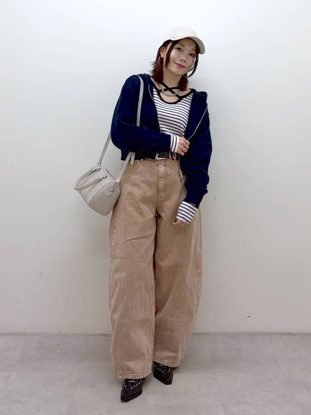 【PBLIM】バルーンデニム #サイズ比較  ̄ ̄ ̄ ̄ ̄ ̄ ̄ ̄ ̄ ̄ ̄ ̄ ̄ ̄ ̄ ̄ ̄ ̄ 【パンツ】 PBLIMならではの思いっきり丸みのあるカーブと加工感が高見え ウエスト位置はボタンで調整してハイウエストにできるので、骨格ウェーブも優勝できます🏆 Mサイズ→ウエスト最大86cm、ヒップ109.8cm Sサイズ→ウエスト最大79cm、ヒップ103.8cm 【トップス】 パーカー好きにおすすめ♡ 今年マストアイテムはパーカーのニット素材なので、今の時期でも暖かく、スウェットより柔らかく落ち感が出ます ネイビーとボーダーを合わせて今年らしくマリン風なスタイルに *アラフォー低身長なりの大人カジュアルスタイルを楽しんで毎日更新しています!ぜひフォローお願いします◡̈*