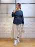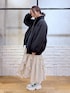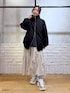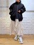 ストリートmixのフリルスカートスタイル  ̄ ̄ ̄ ̄ ̄ ̄ ̄ ̄ ̄ ̄ ̄ ̄ ̄ ̄ ̄ ̄ ̄ ̄ ̄ ̄ 【アウター】 こういう薄手で着膨れして見えないシルエットの中綿を求めてました! 中にニットでもなんでも着込めるサイズ感ですが、袖がラグランになっているので肩が華奢に見えるのがポイント高いです♡ 【トップス】 オフショルでもボートネックでも着られるルーズシルエットなロンT しっかりした綿素材で裾がラウンドになっているので、あえてインせずにベルト合わせもおすすめです 【ボトムス】 腰回りにフリルがあってすとんと落ちるので体型カバー◎ 裾のこのランダムなジグザグは、154cmの私が履いてもより軽やかに履けます ウエストはオールゴムで100cmまで伸びて、ベルトループ付きなので締めることもできるのでどんな方でも安心なサイズ感です *アラフォー低身長なりの大人カジュアルスタイルを楽しんで毎日更新しています!ぜひフォローお願いします◡̈*