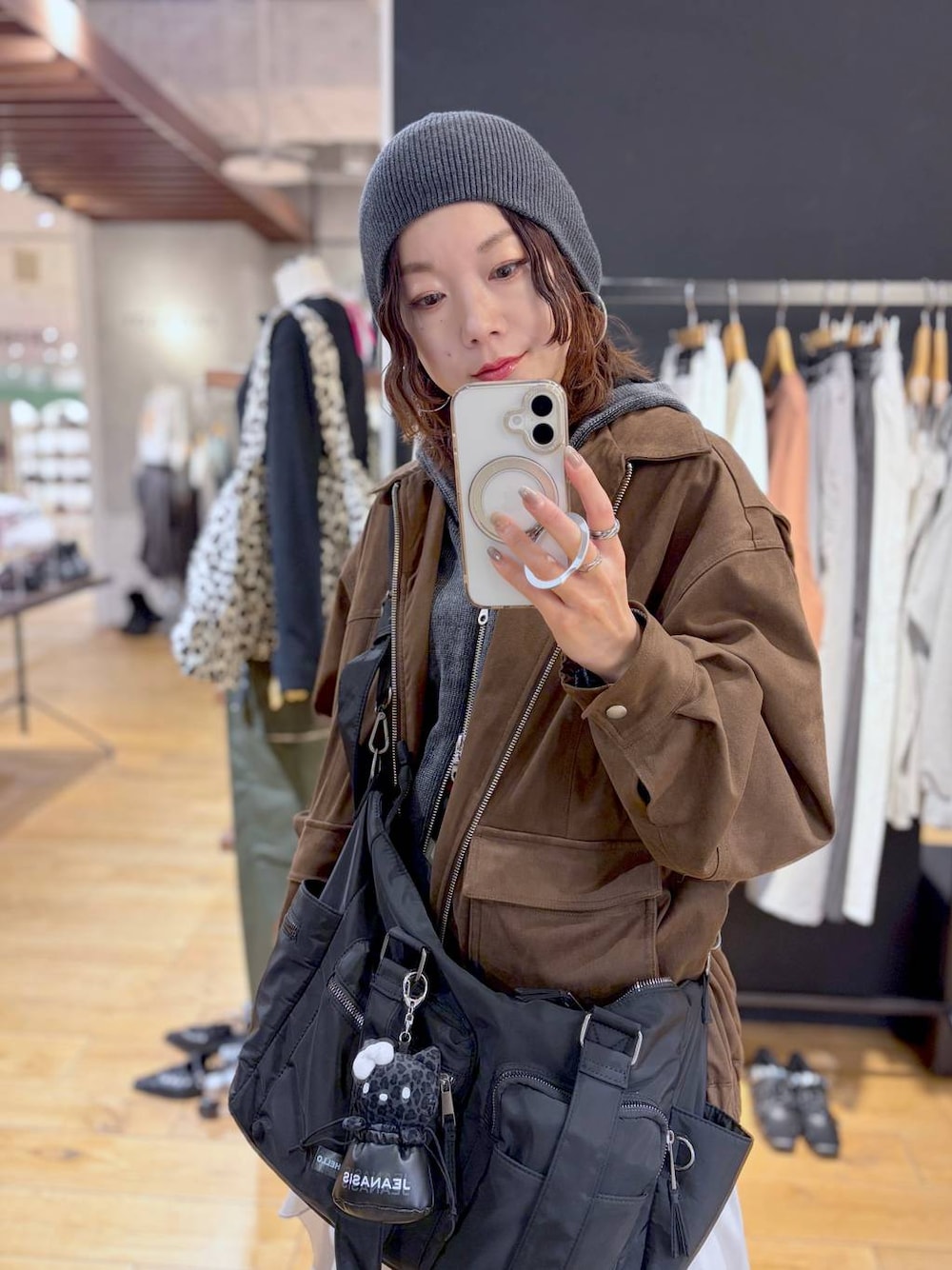 出勤コーディネート🎀  ̄ ̄ ̄ ̄ ̄ ̄ ̄ ̄ ̄ ̄ ̄ ̄ JEANASiSのキティちゃんをさっそくgetしました 黒のバッグにさりげなくいる感じがかわいい♡ 【アウター】 フェイクスウェードでそこまで肉厚ではないので寒暖差のある今の時期の通勤にちょうどいいです 手を入れられるサイドのポケットとケータイを入れても落ちないフラップ付きのポケット2つあるのがありがたいです 【トップス】 パーカー好きにおすすめ♡ 今年マストアイテムはパーカーのニット素材なので、今の時期でも暖かく、スウェットより柔らかく落ち感が出ます 【ボトムス】 PAGEBOYの歴代フリルスカート持っていますが、ただ甘いだけじゃなく一癖かっこよさもあるデザインは毎回期待を裏切りません🩶 裾のこのランダムなジグザグは、154cmの私が履いてもより軽やかに履けます *アラフォー低身長なりの大人カジュアルスタイルを楽しんで毎日更新しています!ぜひフォローお願いします◡̈*
