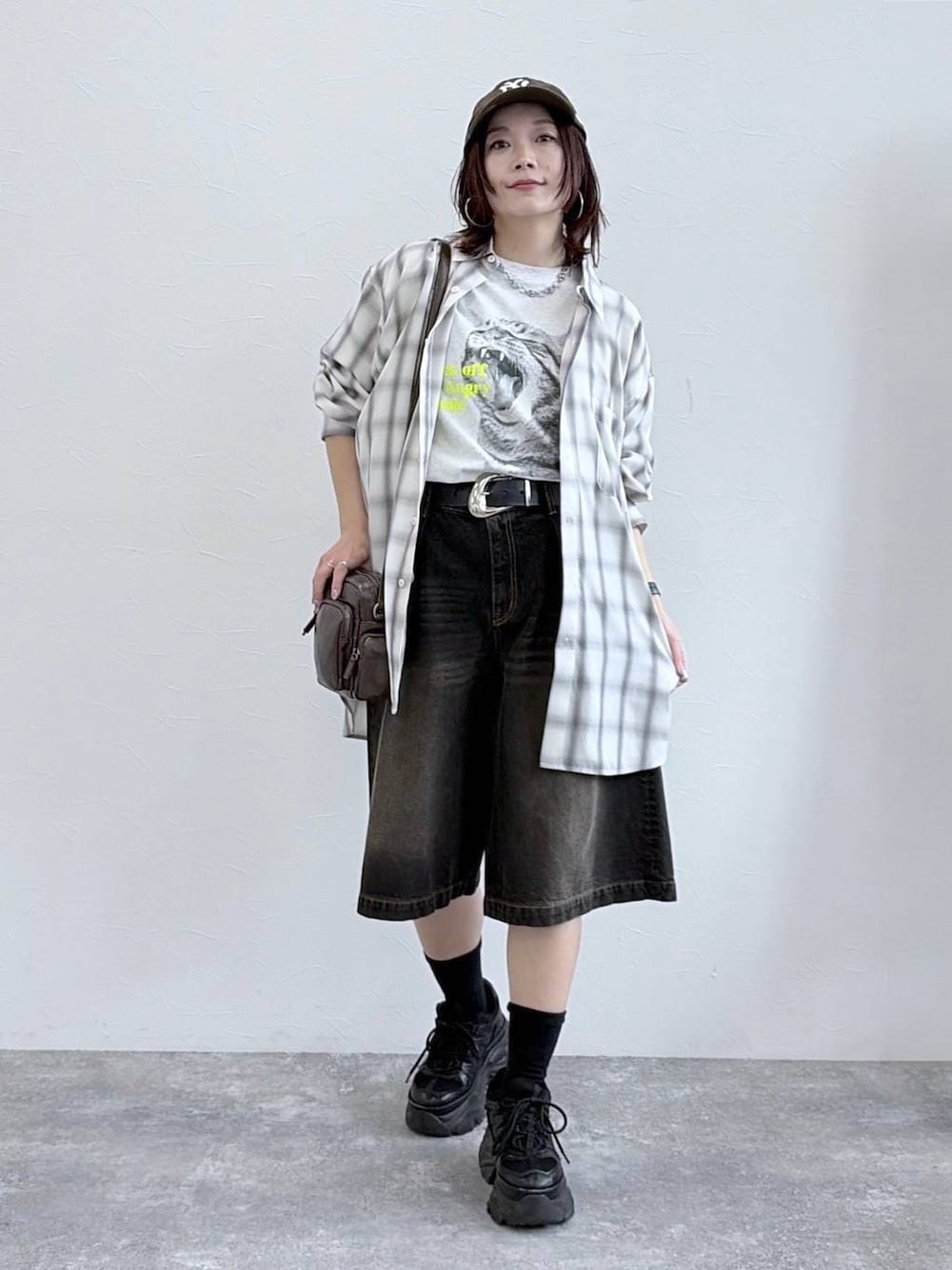 サマーチェックのメンズライクスタイル  ̄ ̄ ̄ ̄ ̄ ̄ ̄ ̄ ̄ ̄ ̄ ̄ ̄ ̄ ̄ ̄ ̄ ̄ ̄ 【トップス】 とろみ感のあるレーヨン素材のシャツでオーバーサイズでもすっきりとしたシルエットでさらっと羽織れます 淡い配色のオンブレチェック柄なので、秋冬のチェック柄と差をつけて今年らしい着こなしに NewねこちゃんプリントTはモノトーンとカラーのロゴでさりげなく取り入れやすいデザイン🐈⬛ 定番のPBLIMのTシャツより薄手で着心地のよさにもこだわってます 【ボトムス】 昨年大好評だったハーフパンツが今年も登場します! 絶妙にワイドに広がった裾と腰回りのタックが、少年感がなくかっこよく履きこなせるのが推しポイントです *アラフォー低身長なりの大人カジュアルスタイルを楽しんで毎日更新しています!ぜひフォローお願いします◡̈*