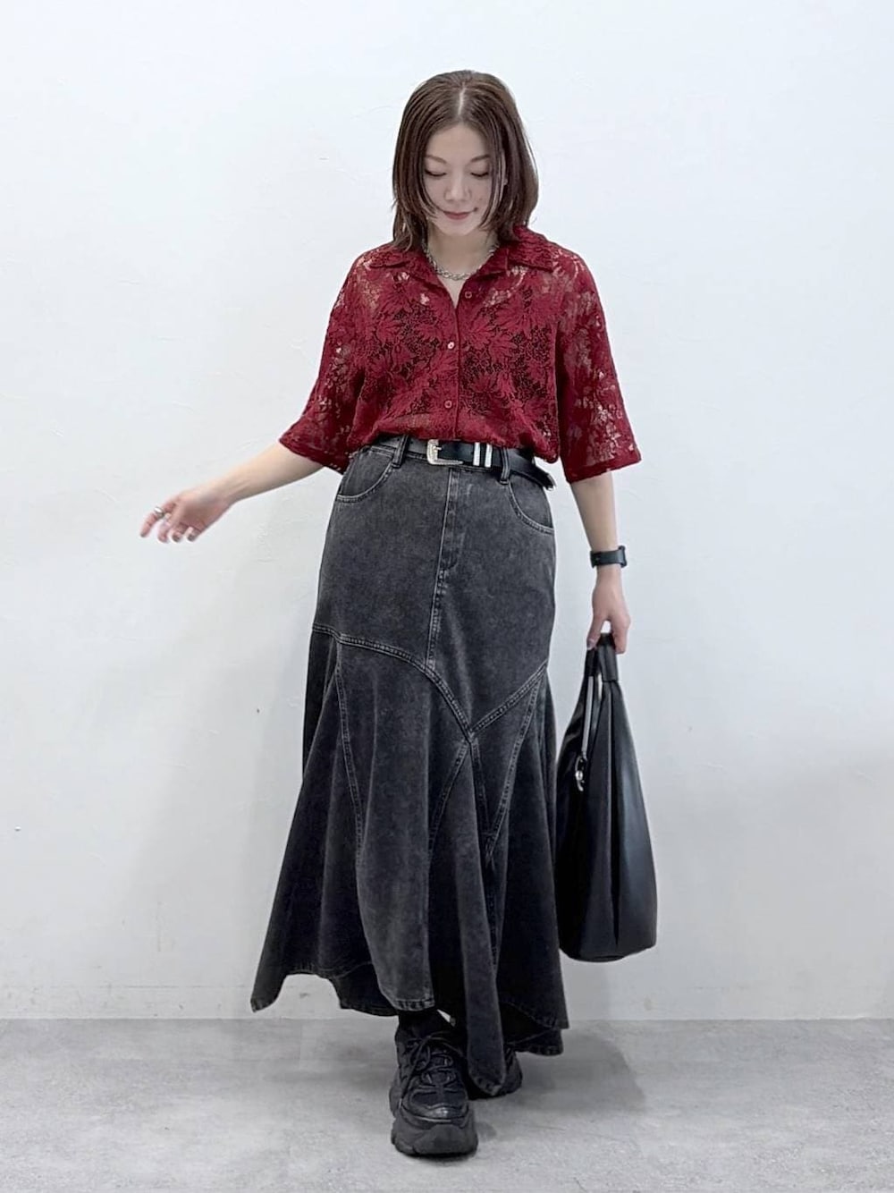 モードに着こなす着痩せ&体型カバースタイル  ̄ ̄ ̄ ̄ ̄ ̄ ̄ ̄ ̄ ̄ ̄ ̄ ̄ ̄ ̄ ̄ ̄ ̄ ̄ ̄ ̄ ̄ 【トップス】 去年大好評だったブラウスがweb限定で帰ってきました✨ 大きめなお花のレースが目を惹くブラウスで、開襟シャツなので甘さ控えめに ひじまで隠れる6分丈なのでキャミソールの上から羽織りとしても安心します 【ボトムス】 このスカートは絶対買うと決めてました(色悩み中) 私の身長でも厚底を履かなくてもいける丈なのが嬉しい♡ トレンドの裾イレヘムはこのジグザグしたラインのおかげで足首細見え効果も✨ ヒップの一番高い位置からの切り替えになっているので、腰が張って見えないのもポイントです *アラフォー低身長なりの大人カジュアルスタイルを楽しんで毎日更新しています!ぜひフォローお願いします◡̈*