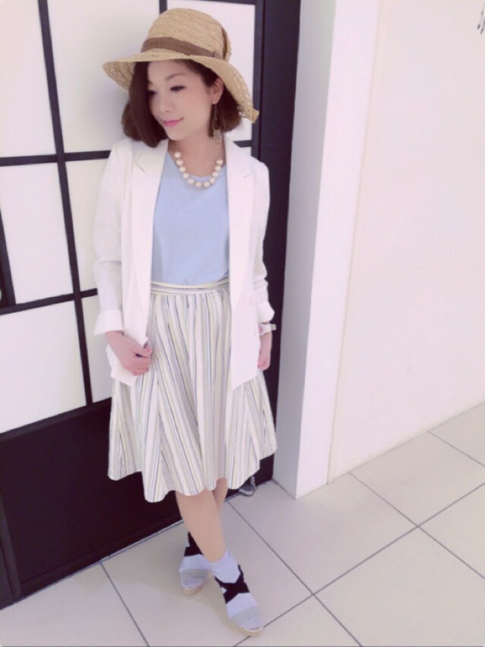 膝丈スカートにソックスでガーリーコーデです◡̈* 白ジャケットで爽やかな色合いにしました。
