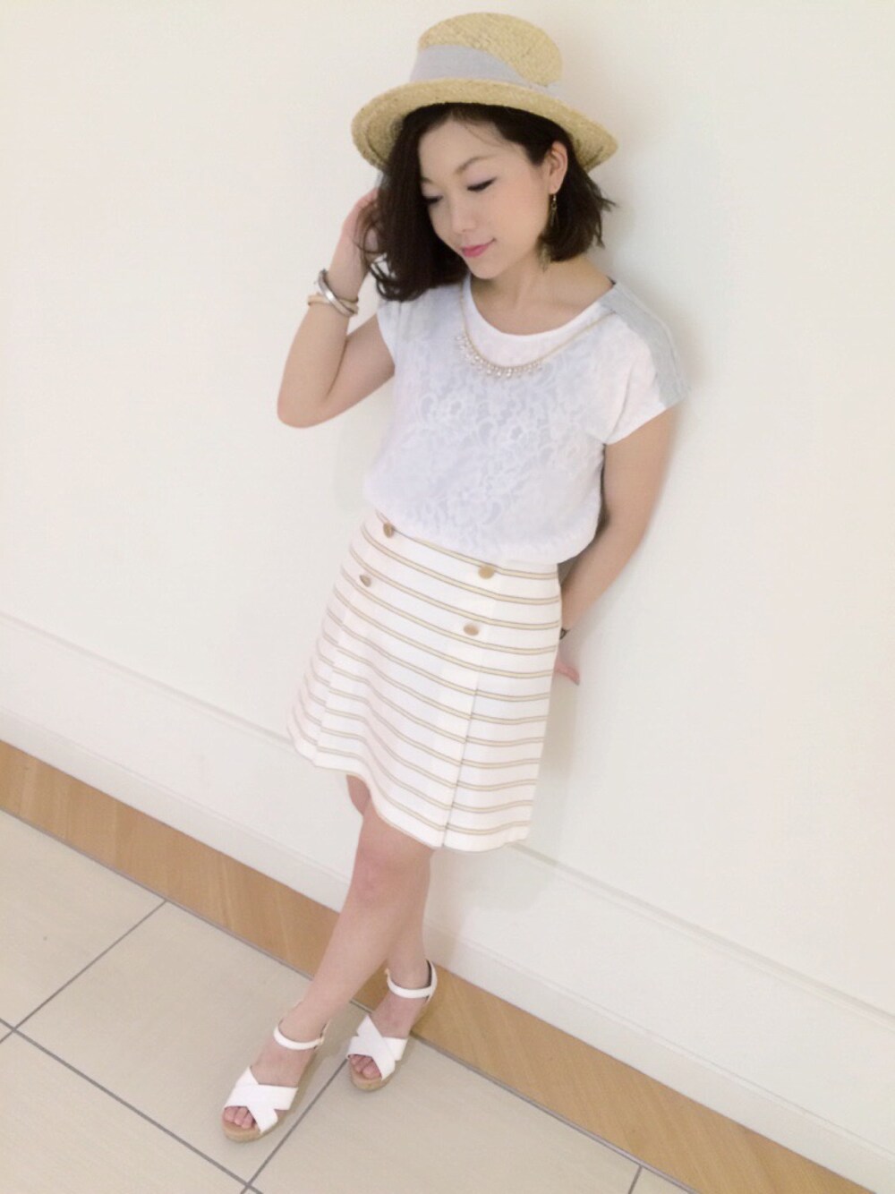 涼しげなワントーンコーデ* ほんのり透けるレースのトップスにはマリンボーダーでちょっと上品コーデに♪
