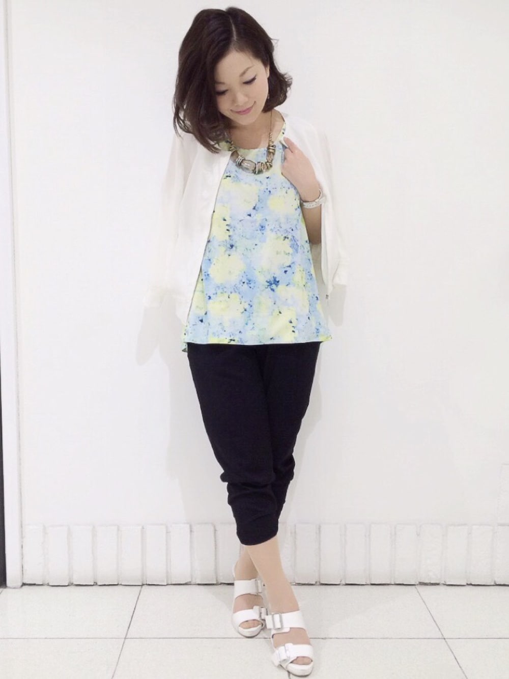 白メインだった初夏コーデを黒ボトムに変えると新鮮になりました☆ 柄トップスにウエストゴムで楽チンなテーパードパンツはお出かけにぴったりなアイテムです♪