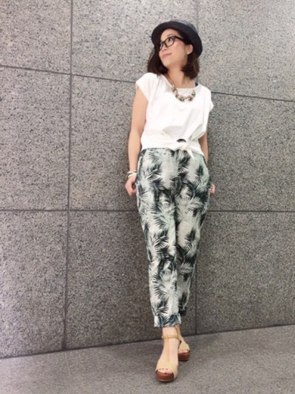 柄物でもワイドでも前結びのショートTシャツならバランス良く着こなせます◎