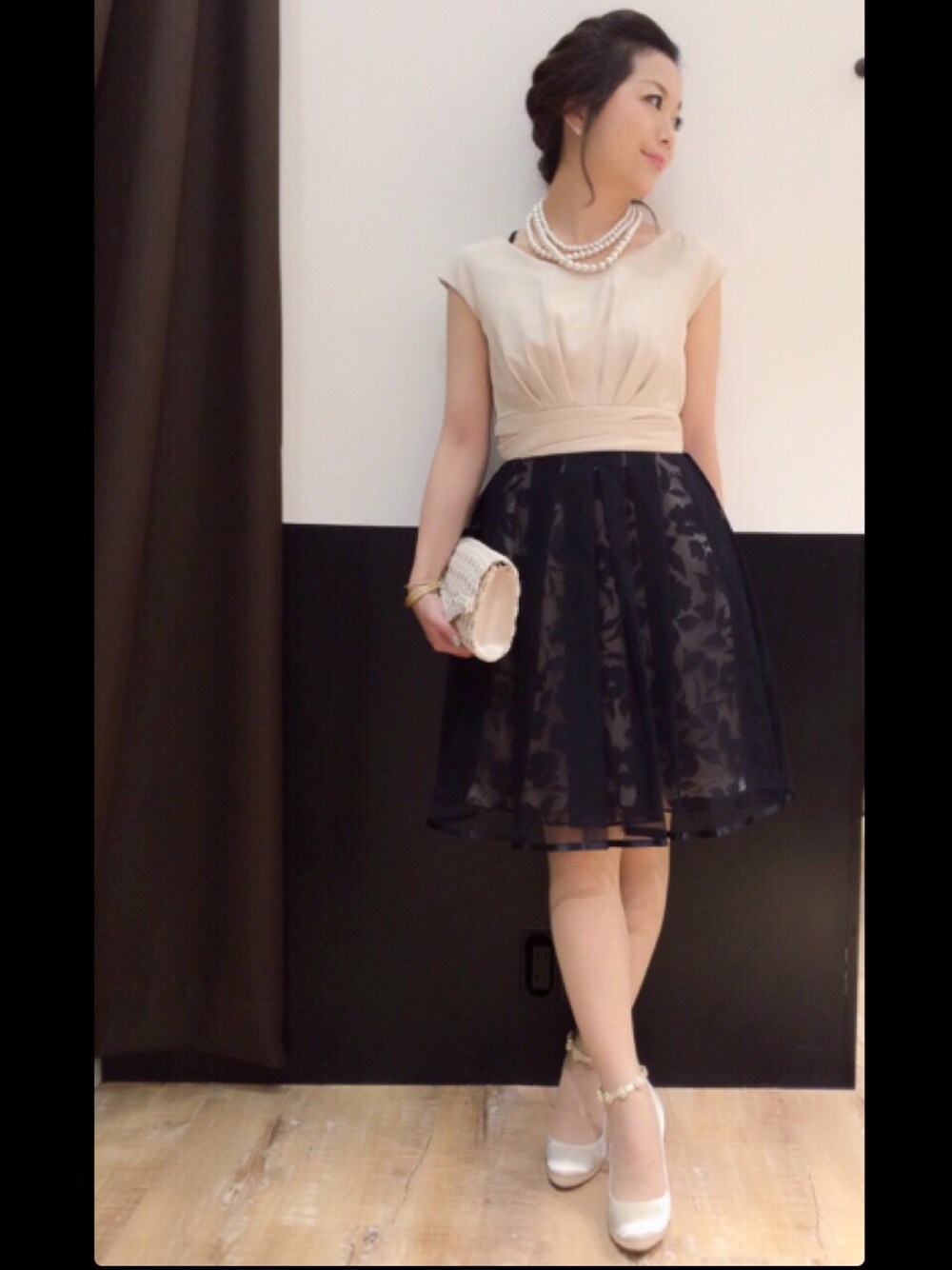 シャンタン生地にチュールのドッキングワンピース* スカート部分の花柄で、結婚式でも華やかに出席できます◡̈*