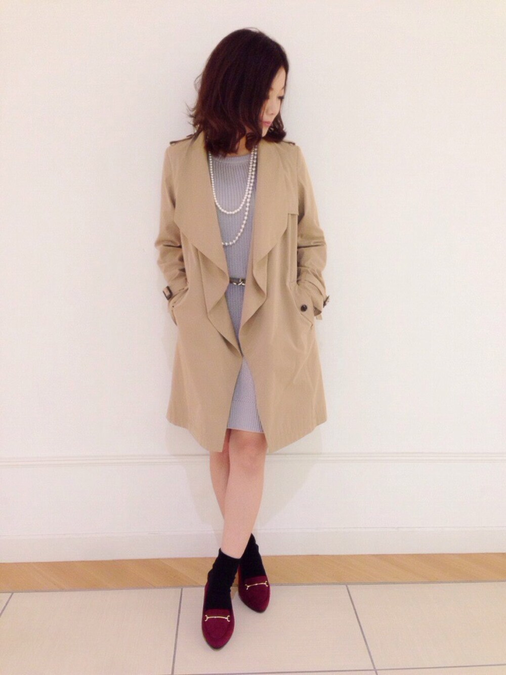 ニットワンピースとパールで女の子らしいコーディネートに、あえてオーバーサイズめなトレンチコートで気軽なお出かけスタイルに◡̈*
