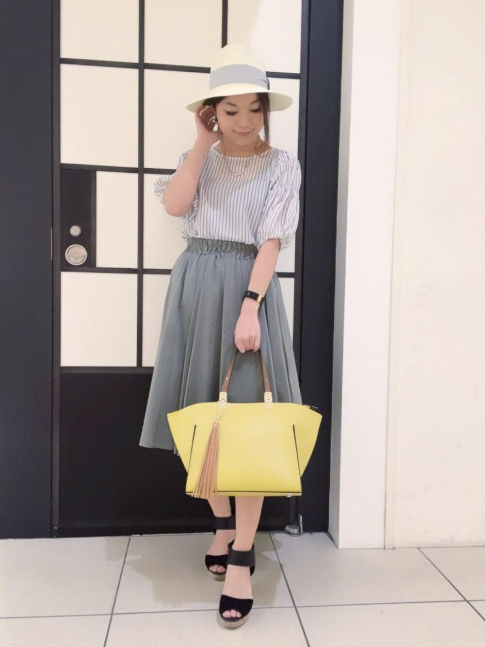 ミディ丈のスカートをハイウエストでインすると、わたしくらいの小柄さんでもバランス取れます^ ^