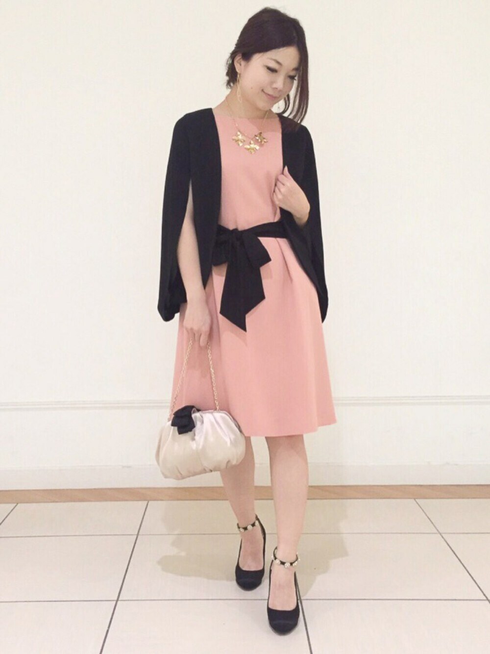 オレンジ×ブラックのバイカラードレス◡̈* ウエストリボンとサイドが配色になっていて細見えします✨ 黒の変形ジャケットでフェミニンさ抑えたコーディネートも◎ 小窓にサイドのデザインも入れてます♪