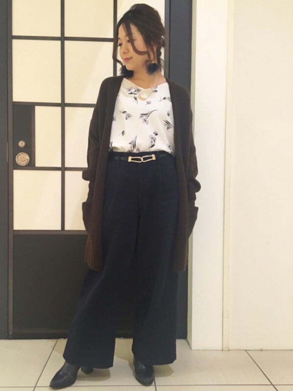 単色の花柄なので、柄が主張し過ぎず大人っぽくまとまります◡̈* ドロップショルダーになっているので、肩周りがゆったりしていて、ブラウス特有のつっぱり感がなく動いやすいですよ! 154cmのわたしでもワイドパンツにロングカーディガンでバランスがとれます♪