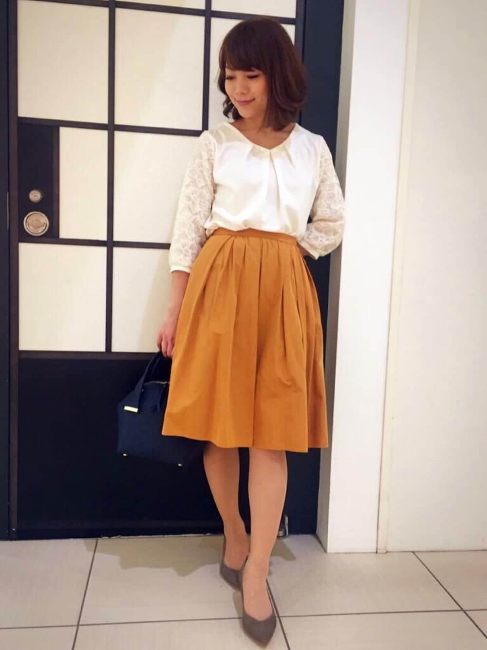 春はカラースカートに注目です♪ グログラン素材のスカートは張り感があってふんわり広がったシルエットになります 袖に透け感があるトップスを合わせれば重めなカラーも春らしく軽い印象にまとまります◡̈*