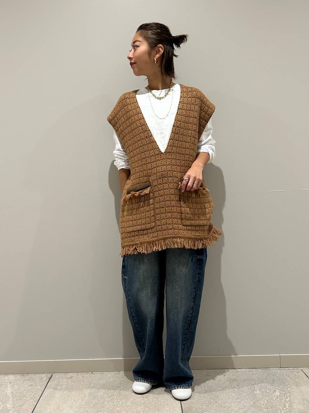 フリンジニットベストは長めの丈感でトレンド感のあるシルエットが◎ ロンTにデニムでカジュアルコーデに!