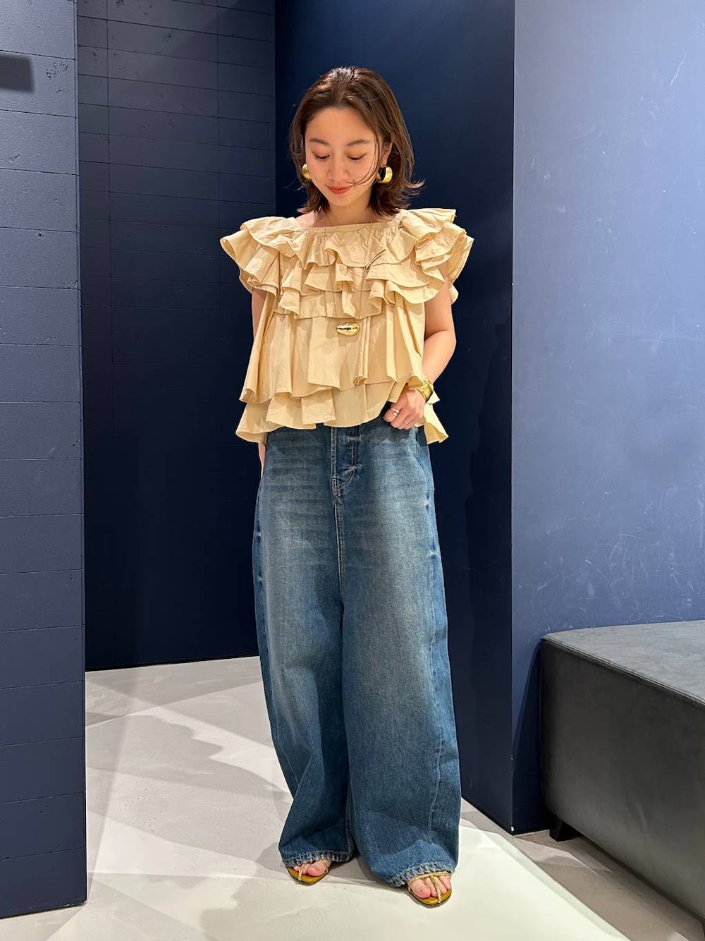 【トップス】 ギャザーたっぷりのデザインが素敵 大好きなイエローカラーで春っぽく♡ 短めの丈感でボトムスを選ばずスタイリングできるのも◎ 【ボトムス】 股上たっぷりのワイドルーズデニム 合わせるだけでオシャレ度UP アクセや小物はゴールドで統一してみました♩