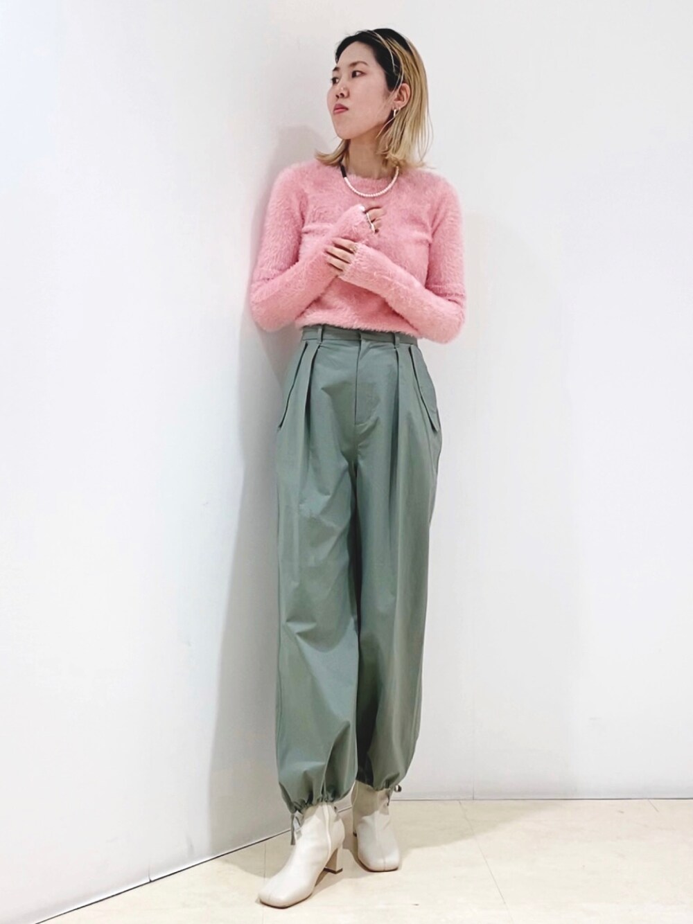 スッキリシルエットのニットとネックレスで女性らしいコーデに カーゴパンツを外しで使いました^ ^ パールとブーツのカラーを合わせて統一感を出すとコーデしやすいですよ♡