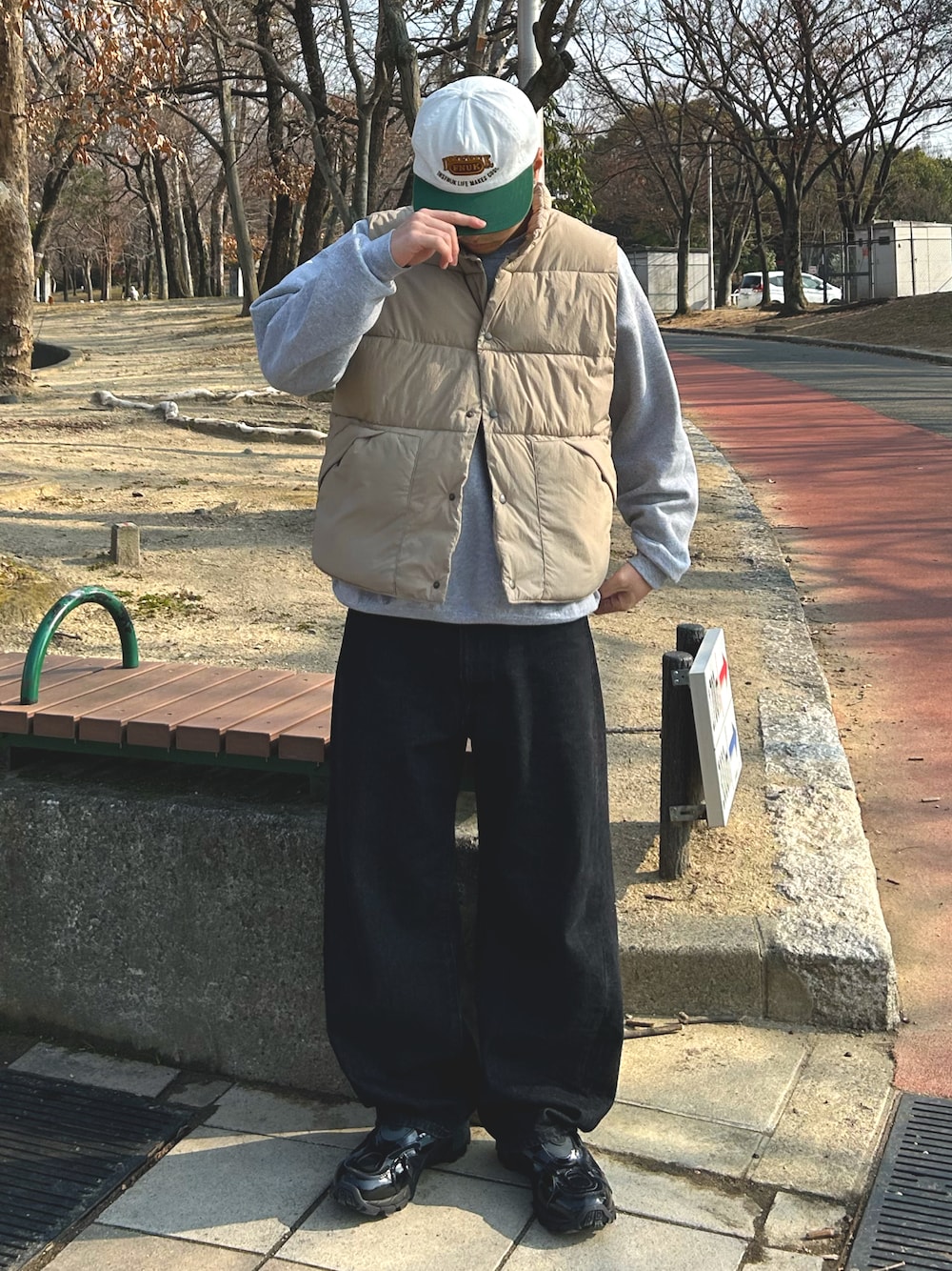 Shimoのダウンベスト「【FFEIN(フェイン)】フェイクダウンカラーナイロンベスト / ベスト ダウン オーバーサイズ 中綿」を使ったコーディネート