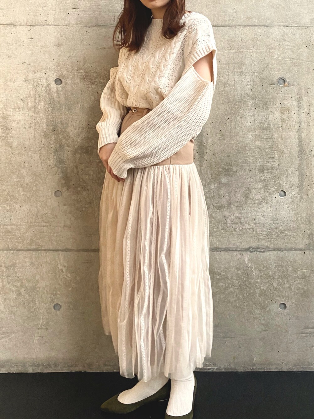 オフホワイトのニットプルオーバーにレイヤードチュールスカートのベージュを合わせてみました☕️ 腰回りがすっきりしていて、スタイルアップなのと、チュールスカートなのに今からでも着れる生地感がポイントですね🎶