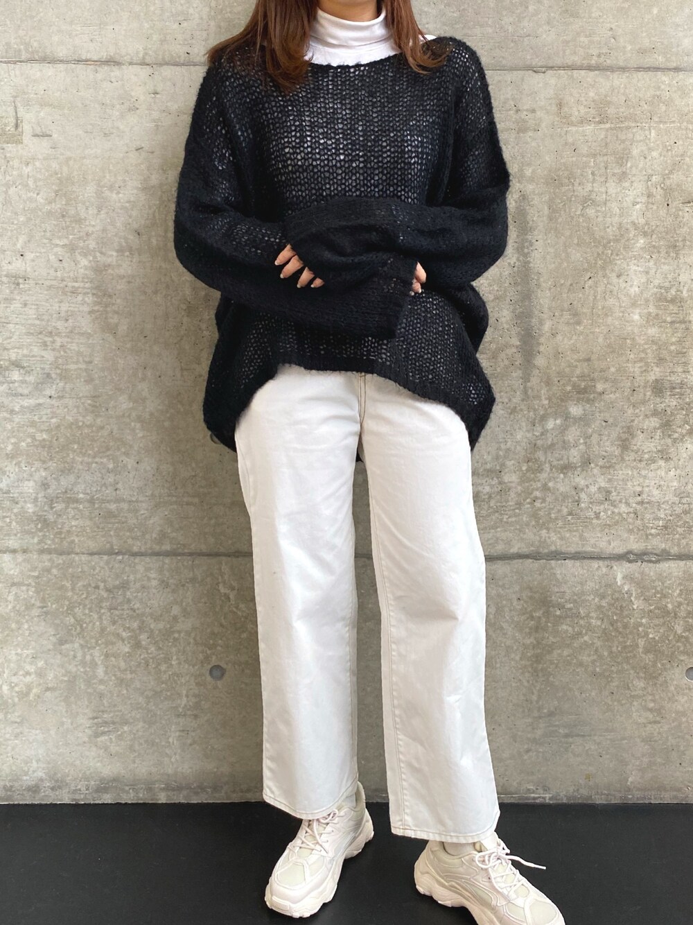 ストリートっぽいモノクロコーデ👟 トップスのシルエットかわいすぎ❤︎ 白いデニムにダッドシューズを合わせて脚長効果〜✌️