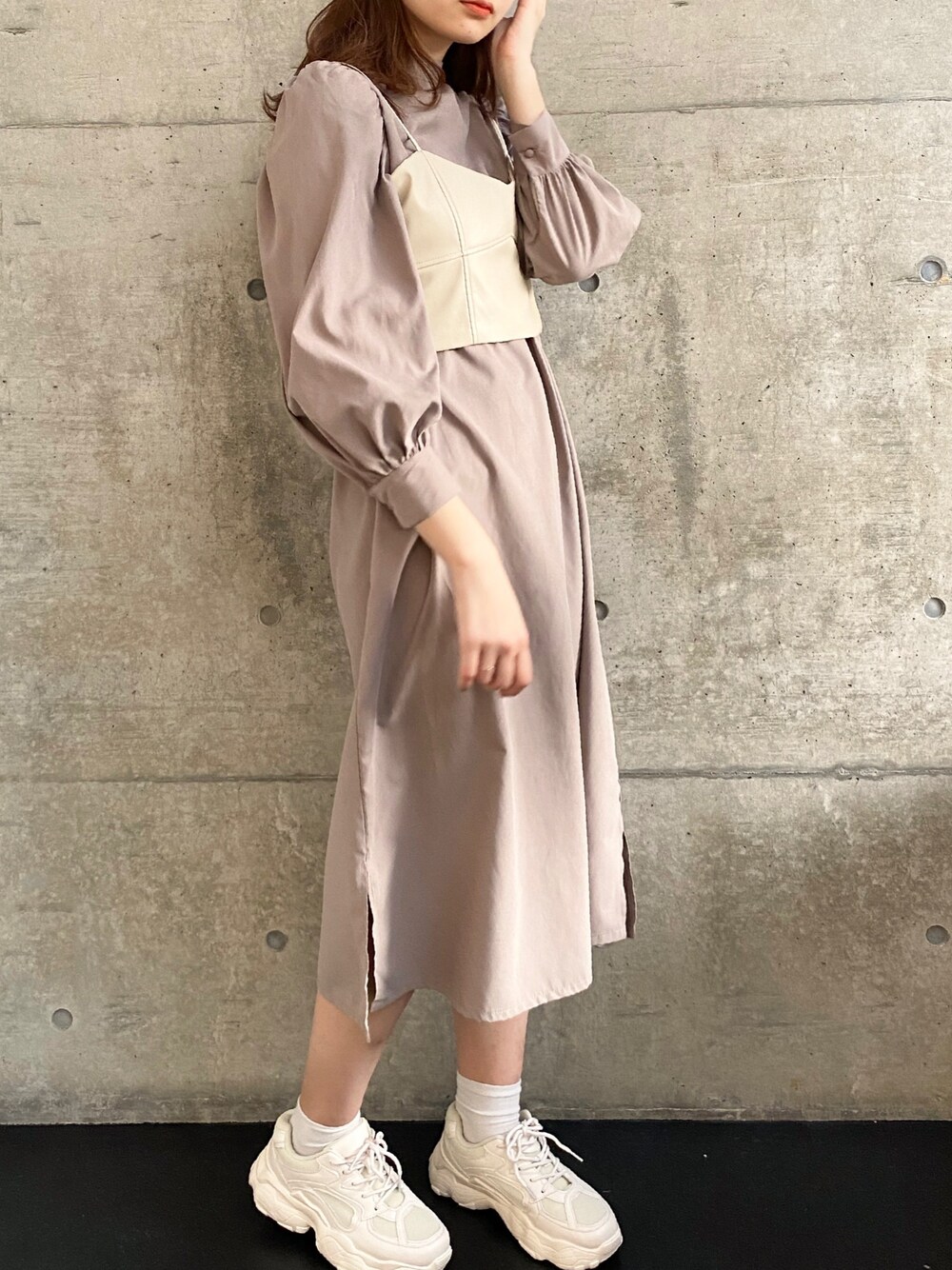 ビスチェとセットのワンピース🐩 ビスチェってワンピースのラインを綺麗に見せてくれるから神様🧏🏻♀️ ダッドスニーカーって流行ってるけどなににでも合わせられるから便利〜🥰