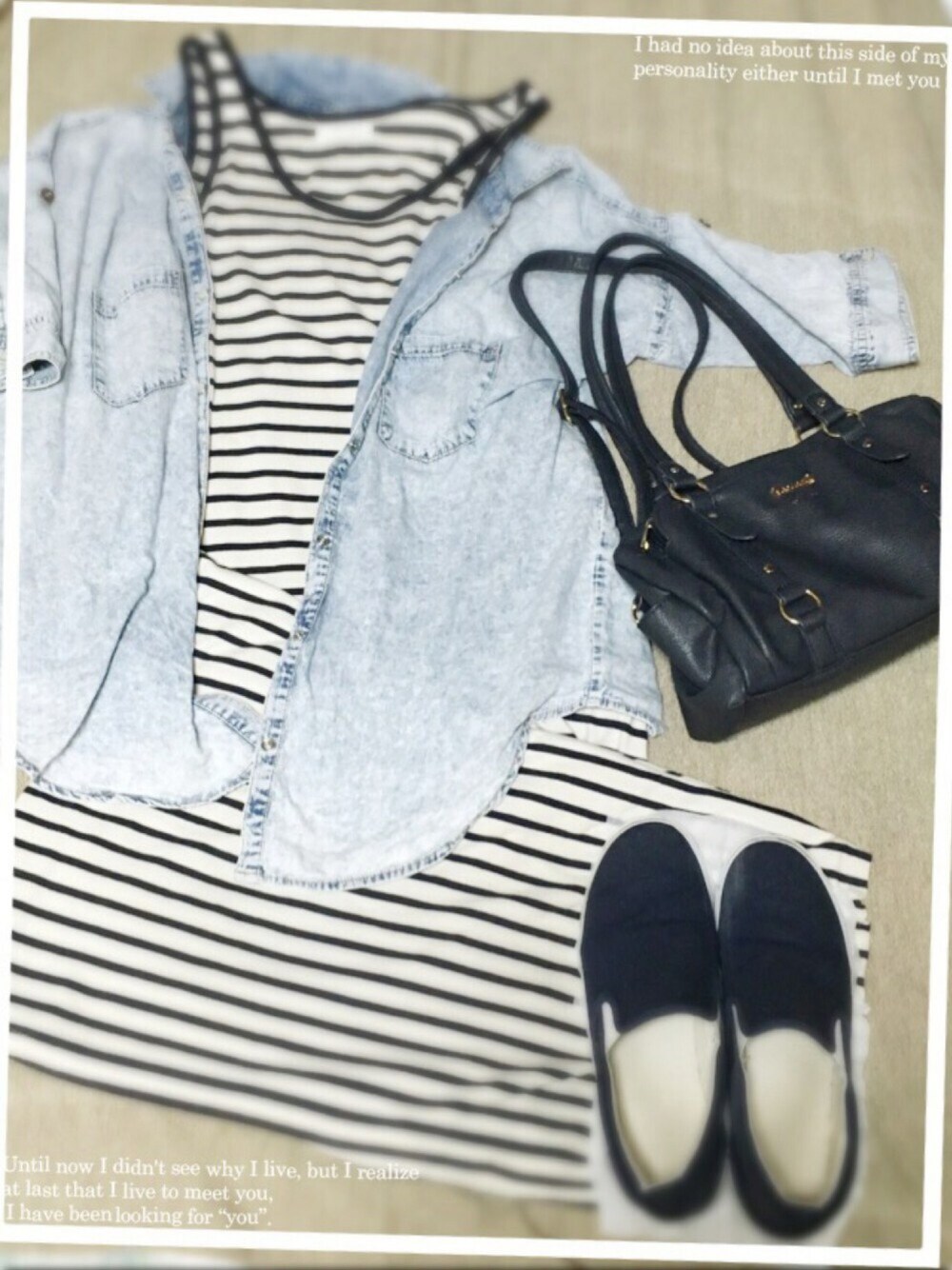 🏝マリン風コーデ🏖 デニムシャツ☞スピンズ ボーダーワンピース☞ローリーズファーム スリッポン☞GU 鞄☞ノーブランド(福岡コアで購入) ちょっとそこまで🎵というときの楽コーデ☺︎