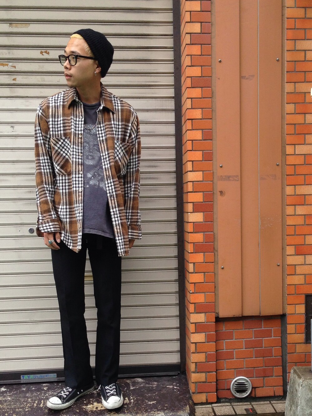 ゆるいサイズ感のネルシャツにタイト目なパンツでバランスをとりました! すべてeightで購入