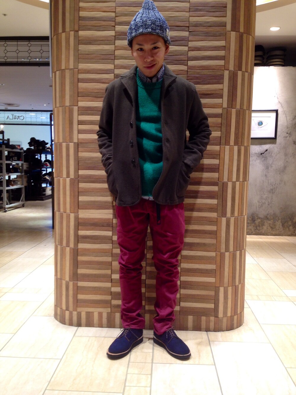 色味を抑えたクリスマスカラーコーデ! グリーンのニットが美しい!!