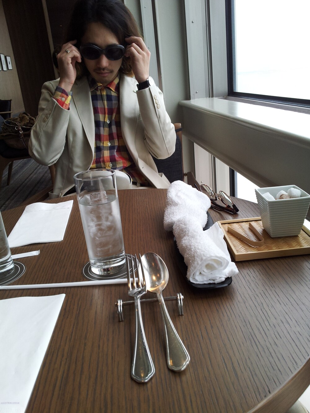 はまぐちしんごのテーラードジャケット「ジャケット ・BURNER シャツ 貰い物 サングラス オリバーゴールドスミス」を使ったコーディネート