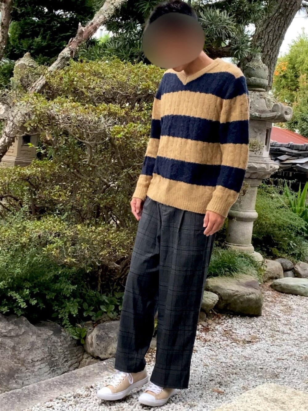 閲覧ありがとうございます。今回は、ボーダーのニットセーターと、チェック柄ワイドパンツを合わせてみました😌