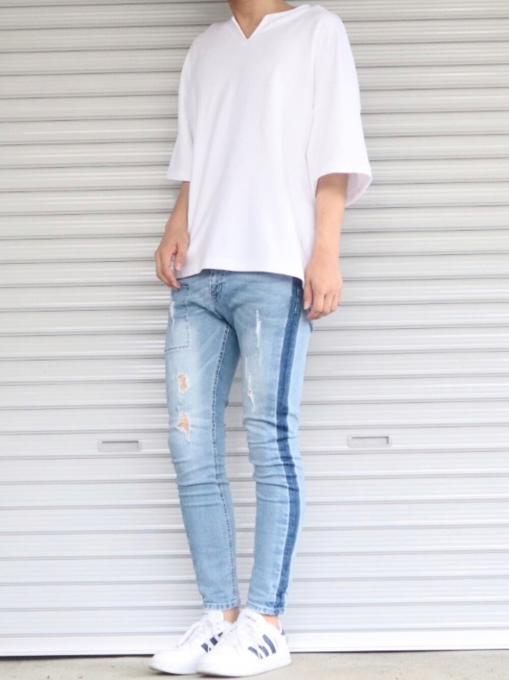 Shinのデニムパンツ「ダメージ加工ライン入りスキニーデニム」を使ったコーディネート