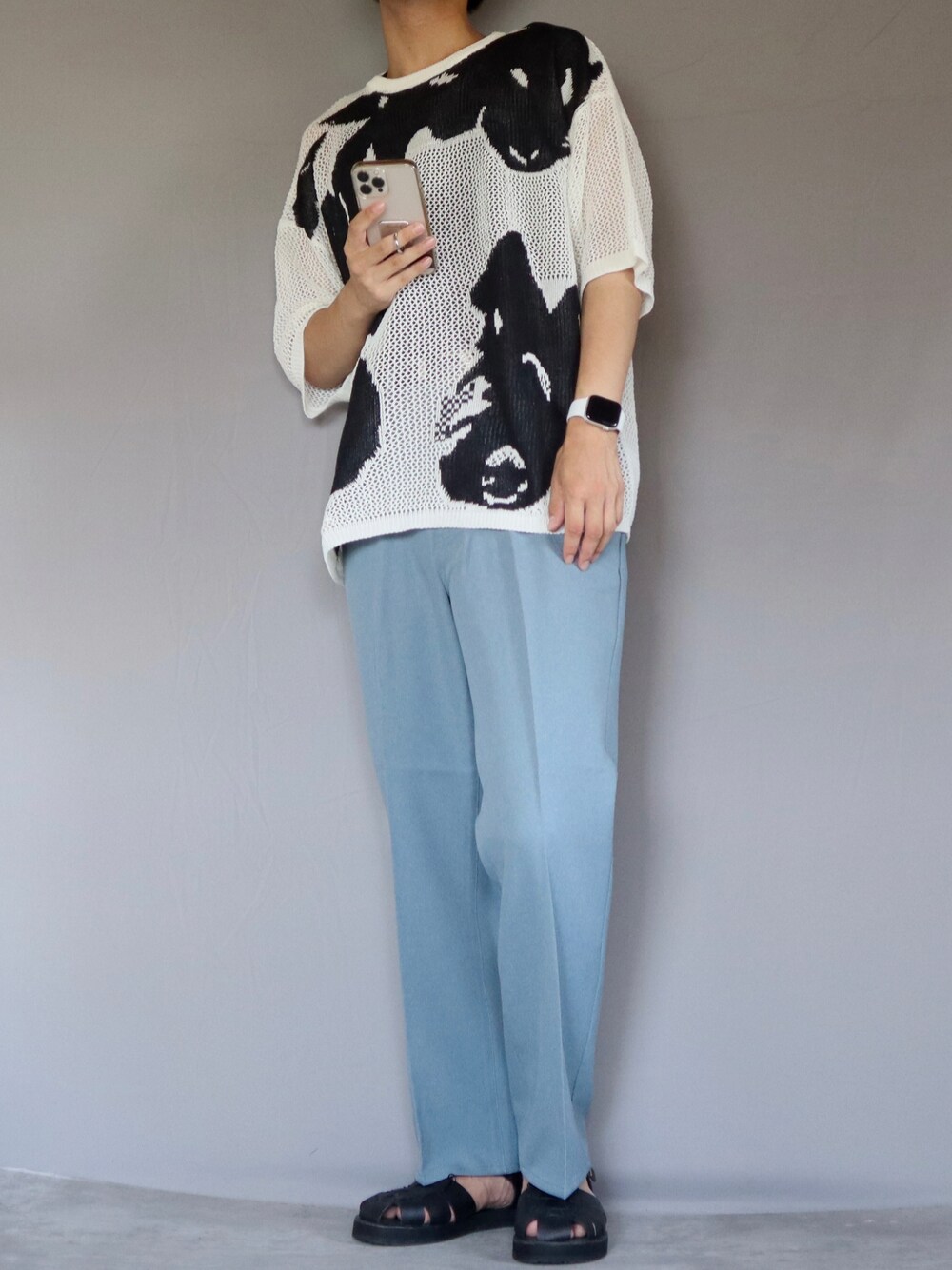 Shinのニット/セーター「ニュアンスメッシュプルオーバー」を使ったコーディネート