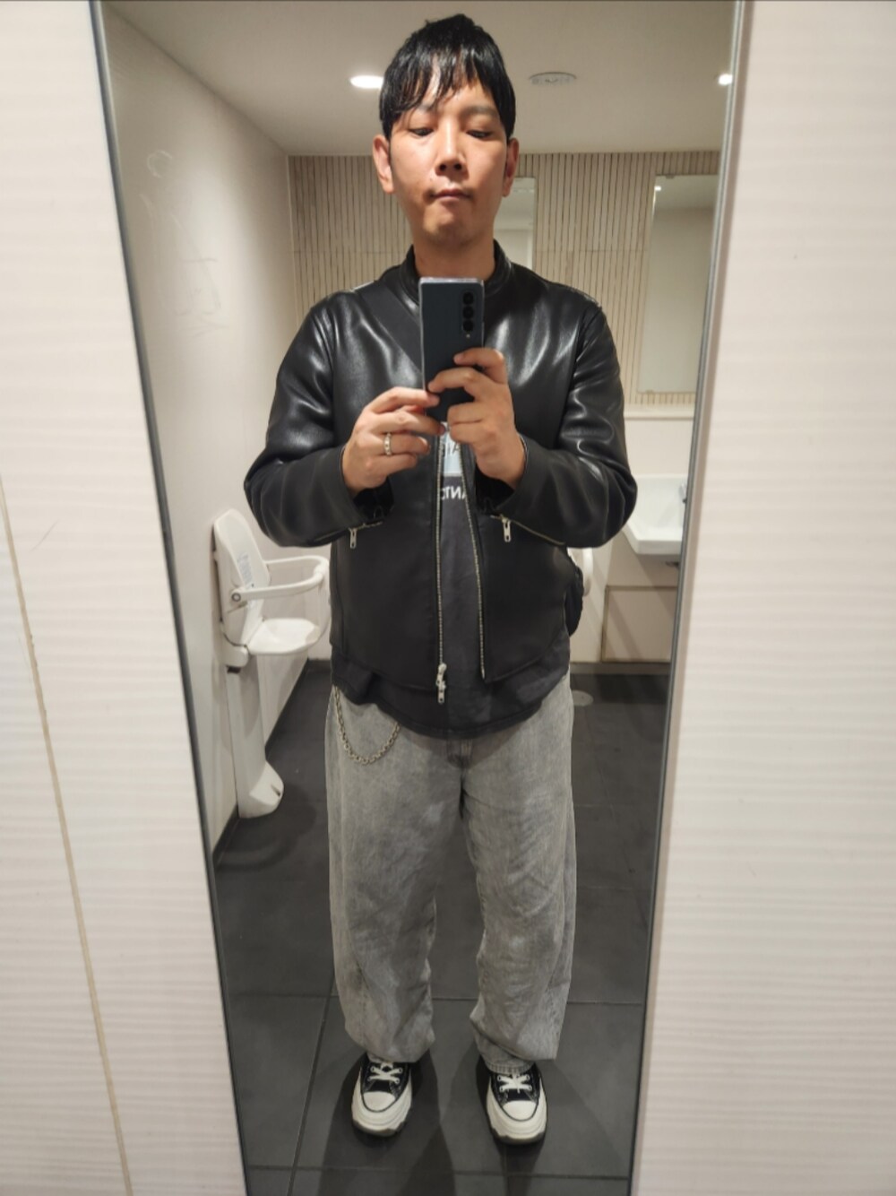 今日のコーデ。SHIPSのラムレザーシングルライダースに古着のハードロックカフェのClassic Logo T-shirt、GUのバレルレッグジーンズ、コンバースのTREKWAVE CS HI、WOMAN ON SKULLショルダー、ピック型ネックレス、ウォレットチェーン。 嫁が合わないと言ってた革ジャン×バレルレッグ、今年は50いいね超えたから良しとしよう。