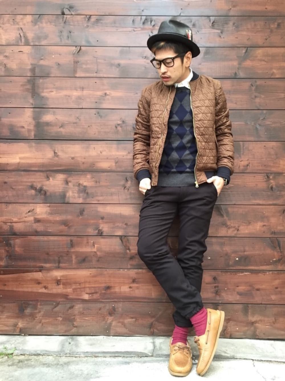 流行のブルゾンを軸に綺麗めにコーデ。足元はジョガーパンツにカラーソックス。冬でも履けるボア付デッキシューズで遊んでいます♪