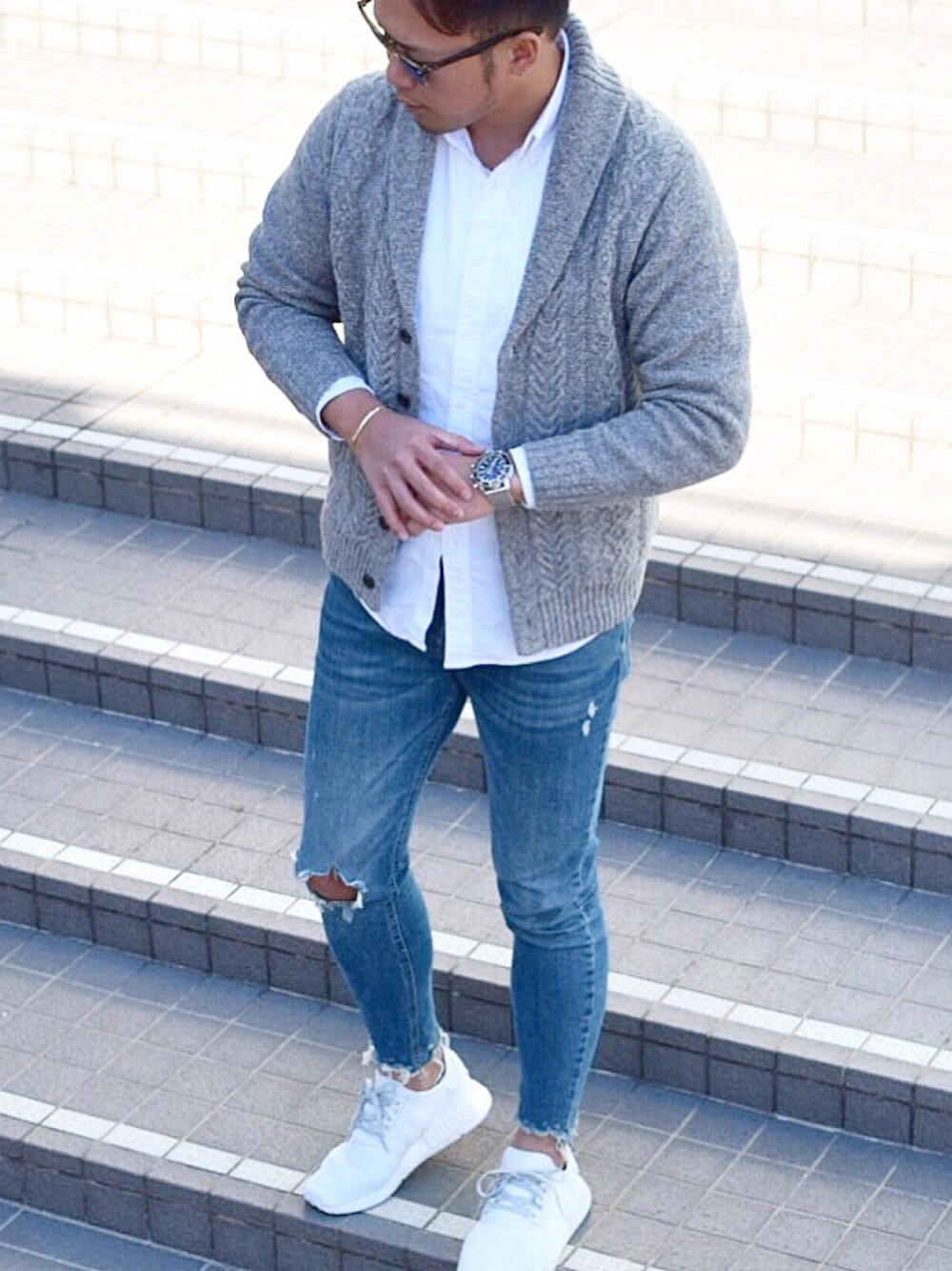 Ootd👖 shirt × cardigan シンプルシャツスタイル🚶 足元はnmd_R1👟 履き心地もデザインも最高です✨ いつもイイネ、save、フォロー頂きまして ありがとうございます🙇🏽✨