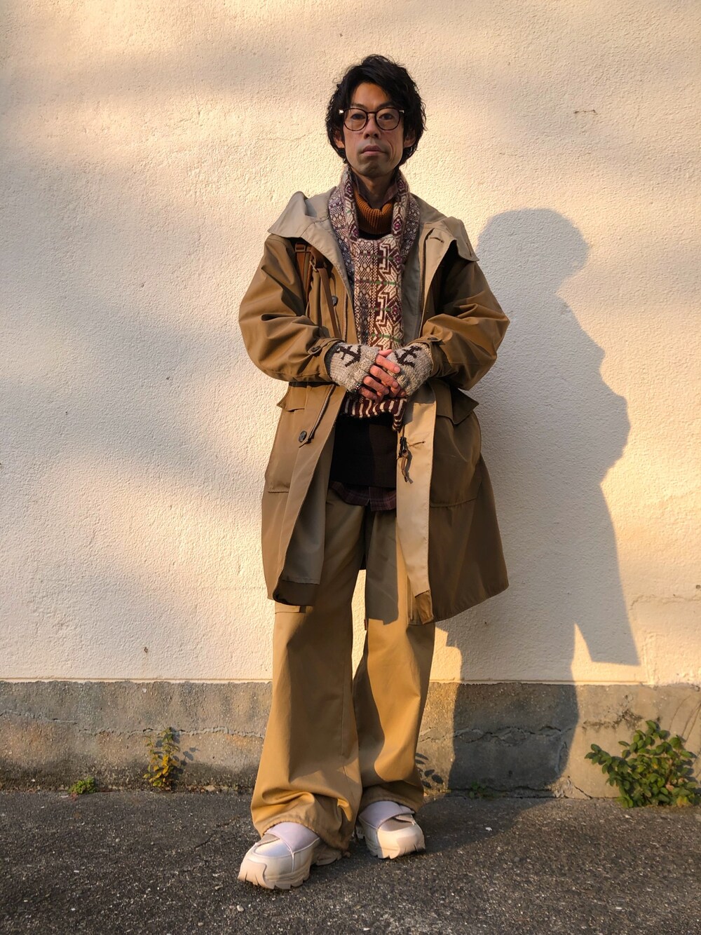 今日のお昼はいつもより暖かかったので、デザインがお気に入りのミリタリー風のコートを主役に同系色でコーディネートしてみました。 NOISE MAKERのワイドカーゴパンツは絶妙な太さとシルエットでとても気に入っています。