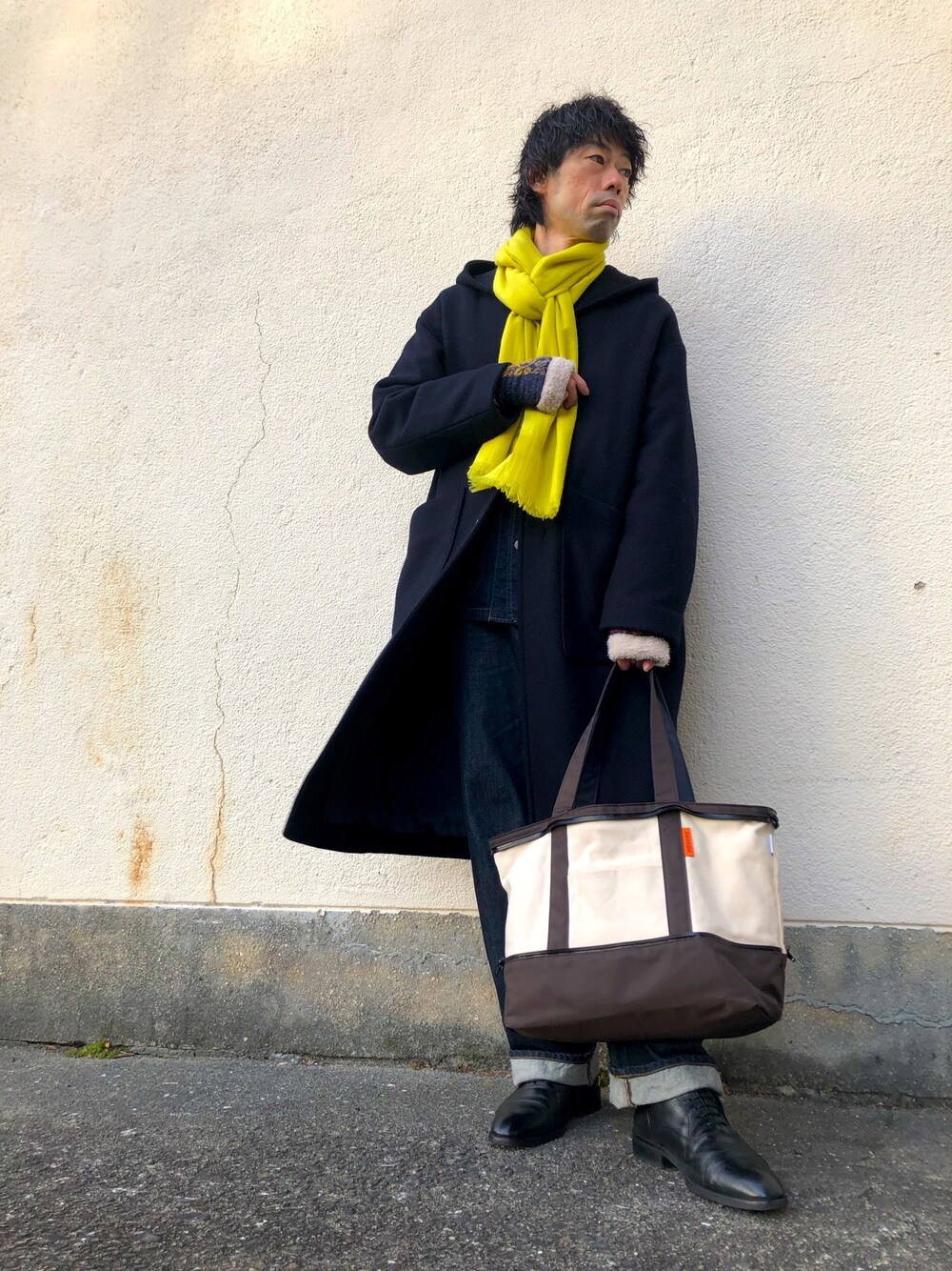 ネイビーのワントーンコーデ! デニムジャケットとデニムパンツでセットアップ風にアウターはオーバーサイズのフードコートを着用しています。 全体的にカジュアルなので靴は黒のドレスシューズにして首元にアクセントでイエローのカシミヤストールを巻いてみました。 キャンバストートは物もよく入り使いやすくて気に入っています。