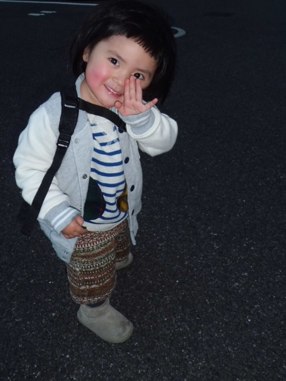 イイネ!ありがとうございます。 今日、前髪を切ってからの初写真です。 うまい具合に手がいい感じになって、小顔効果が出てるような(笑) コーデは、すべてpetit mainです。 靴もpetit mainです。 ズボンは、レギンス?が一緒にくっついていて、しかも裏起毛なのであたたかそうです。 トップスも裏起毛なので、今日みたいに暖かい日は、上着はいらないかもしれません。 背負ってるリュックの中身は、オムツとオムツシートとオムツを入れるビニール袋が入ってます(笑)