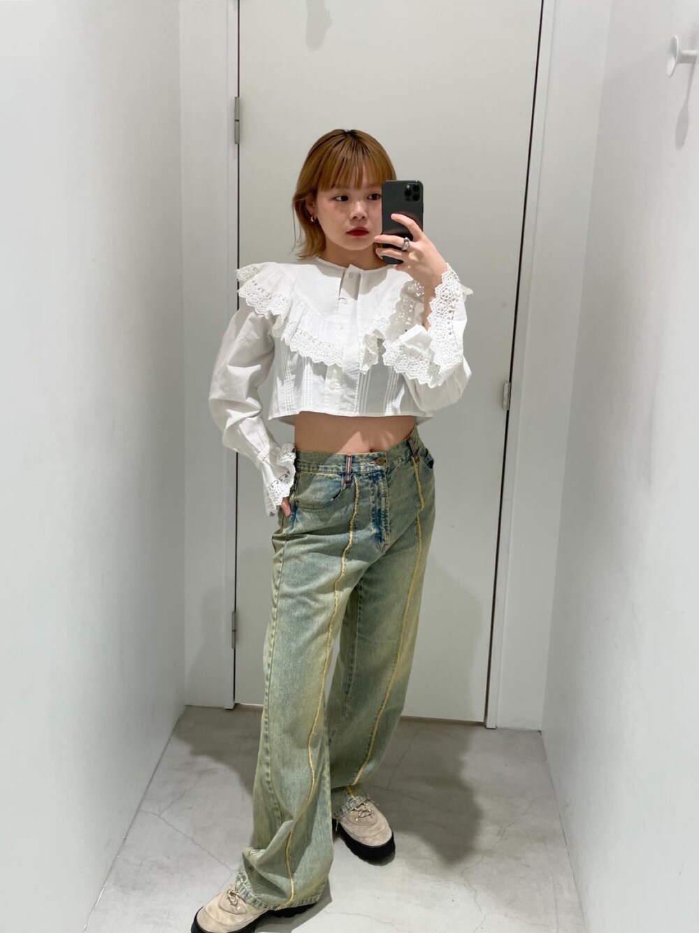 骨格ナチュラル 着用アイテム:ショート丈ブラウス ・一枚で着ても可愛い ・お腹見えデザインでデニムで合わせても◎ ・キャミワンピと合わせても○ 着用アイテム:デニム サイズ:XS ・生地が柔らかくて馴染む ・お尻周り気にならない
