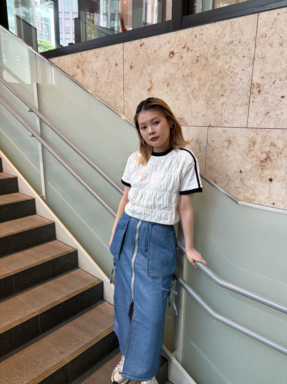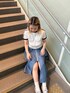 骨格ナチュラル 着用アイテム:tシャツ ・お腹のラインギリ隠れるくらいの長さ ・色の配色が可愛い ・デニムに合わせても◎ 着用アイテム:ラメデニムスカート サイズ:s ・切りならないスリットの短さ ・リボンが可愛い ・中にナイロン素材と一緒にレイヤードしても可愛い