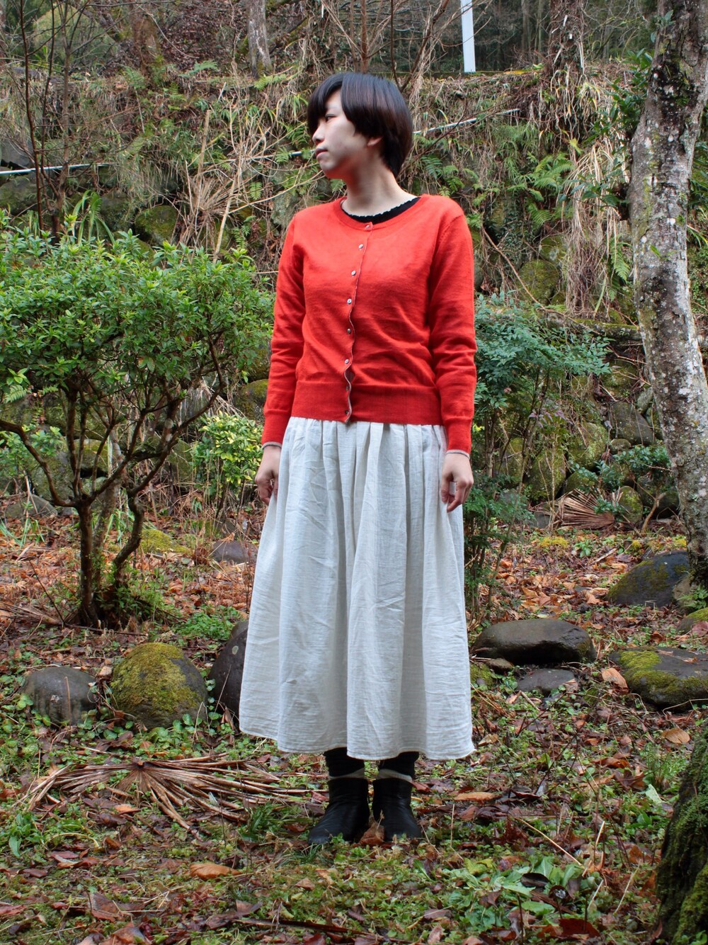 麻のビビッドなカーディガンに真っ白なワンピース。春近し、なコーデ