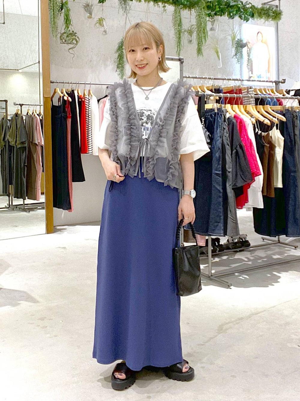 Tシャツは実はマタニティアイテムです! 肘が隠れる長さでゆったり着やすいです ·͜· チュールベストは軽くて涼しいので夏の重ね着も快適です◎ スカートはタイトすぎないシルエットなので足のラインも出にくく、歩きやすいです! 新色のブルーが夏らしくてさわやかです♡
