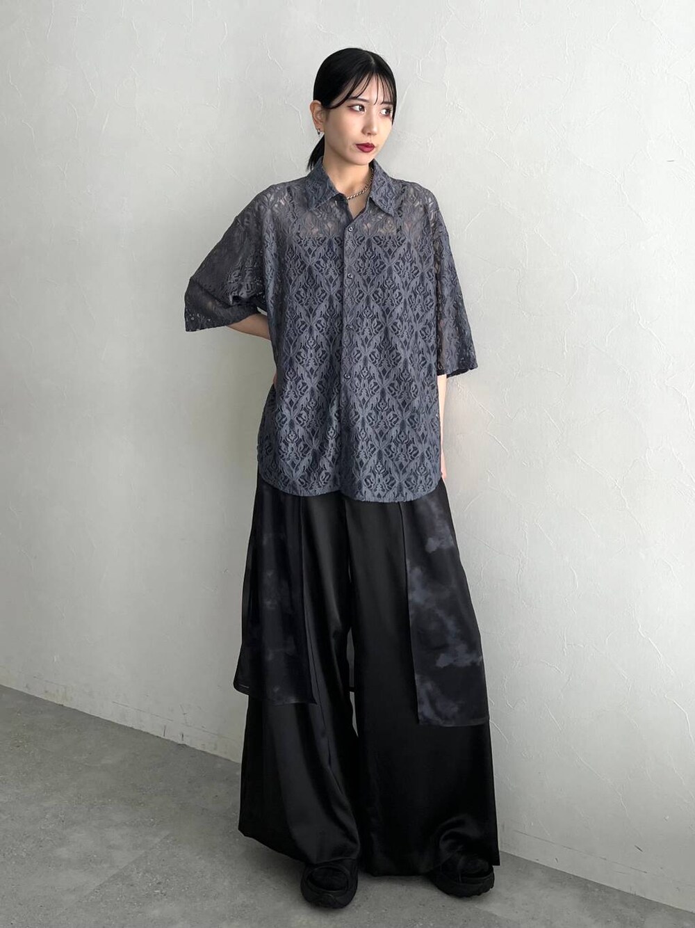 -トップス- 程よい透け感で取り入れやすいです! ゆったりしているのでラフに着れます! -ボトムス- シアー素材がレイヤードされていてアクセントになります!動きが出るのできれいな印象です!