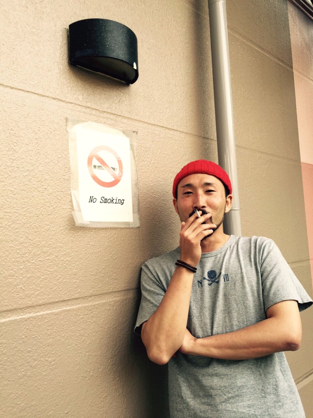 グレー系のTシャツ/カットソー、レッド系のニットキャップ/ビーニーを着用したメンズの冬コーディネートの1枚目の写真