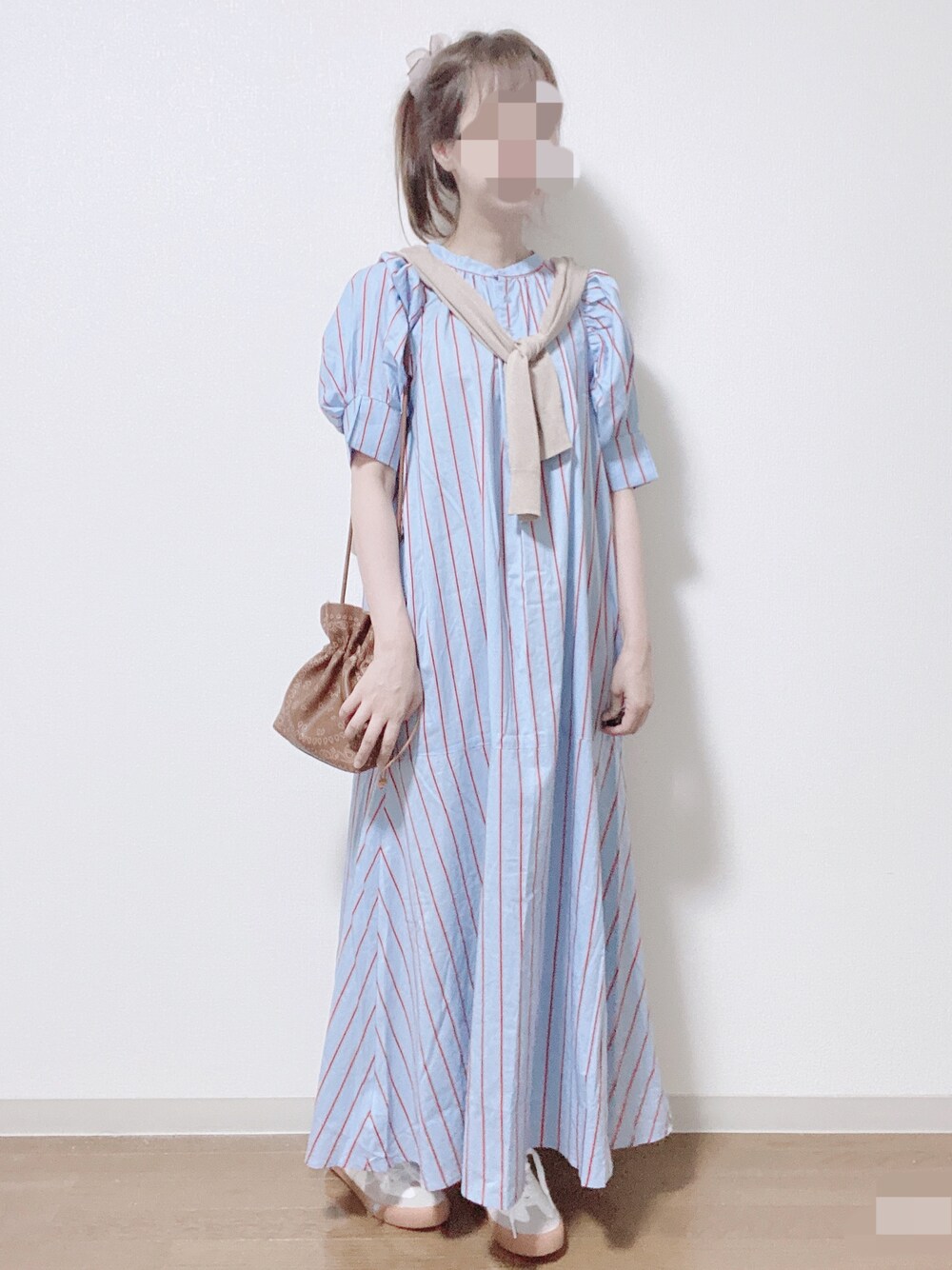 おはようございます🌼 ご覧いただきありがとうございます✨ いいね、お気に入り登録、フォロー、フォルダインいつもありがとうございます💕 今日はストライプにブルーが可愛いすぎるワンピースでコーデしました♡ 一枚だと寂しいのでカーディガンを 肩がけしてアクセントにしました。 肩がけすることで目線が上にいってスタイルアップにも♪ 小物は茶系で統一して柔らかい印象にしました♡