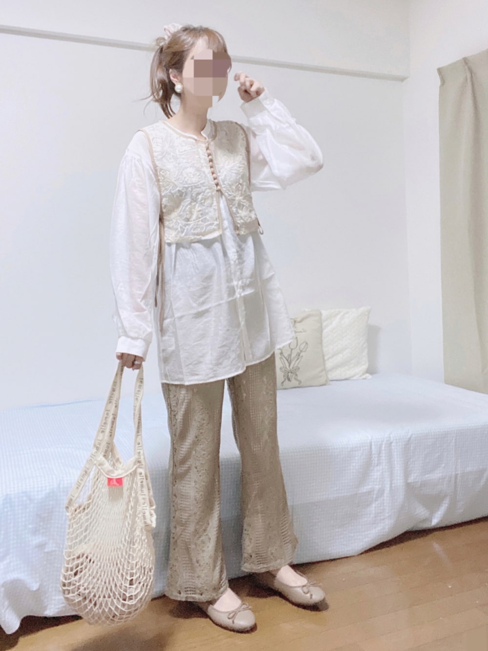 おはようございます🌼 ご覧いただきありがとうございます✨ いいね、お気に入り登録、フォロー、フォルダインいつもありがとうございます😊 今日はアプレジュールクリアさんの トップスで淡色コーデしました🍪 アプレさんのこちらのベスト とっても可愛いです♡ 刺繍とパイピングのお色の組み合わせや たけも短めで合わせやすくてお気に入りです🥰