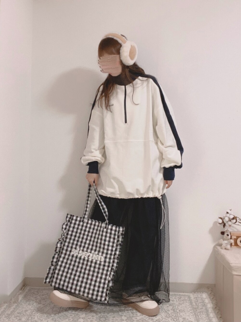 おはようございます♡ ご覧いただきありがとうございます♪ 前回の投稿にいいね、お気に入り登録、フォロー、フォルダイン下さった方々ありがとうございます✨ 今日のコーデ🧸 ライン入りのスウェットは ガーリーなボトムスと合わせても おしゃれになるからお気に入り🥰 ハイネックなのも可愛🥰