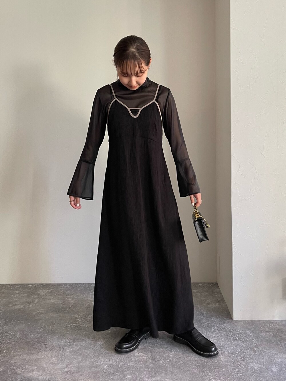 お気に入りのモノトーンコーデ キャミワンピはインナー次第で 雰囲気を変えられるので着回しに大活躍 今回はシアートップスを合わせて きれいめに着てみました! insta☁️ @shiro_eyo