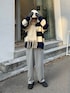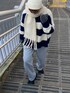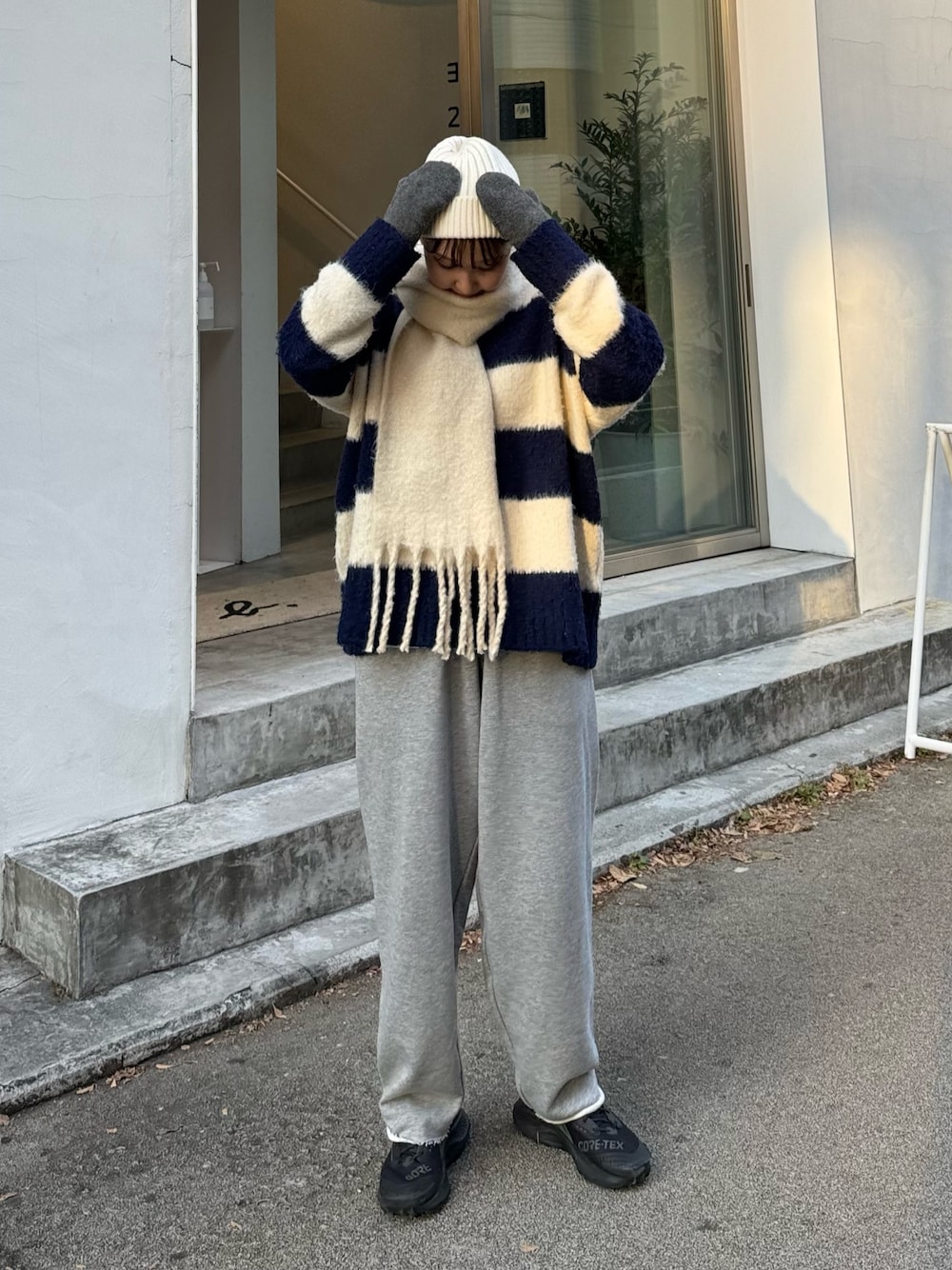 マフラーを主役に組んだ あったかコーデ マフラーはどんな巻き方アレンジもできちゃうサイズ感で 今季かなり活躍してくれてます! マフラーとニット帽、ニットのカラーを合わせたのがポイントです スウェットはメンズのものになりますが ウエストの紐で調節できるので レディースの方も着れるアイテムです insta☁️ @shiro_eyo